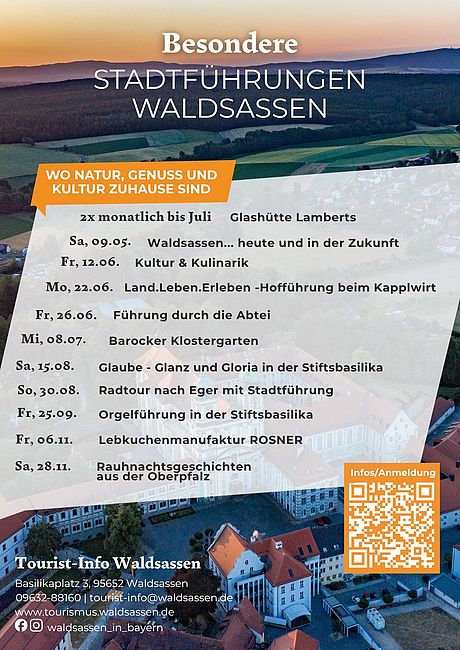 Alle Veranstaltungen finden Sie hier, sie können ab sofort online über den Erlebnisshop auf www.tourismus.waldsassen.de oder telefonisch gebucht werden! Tourist-Info Waldsassen, 09632 88160
