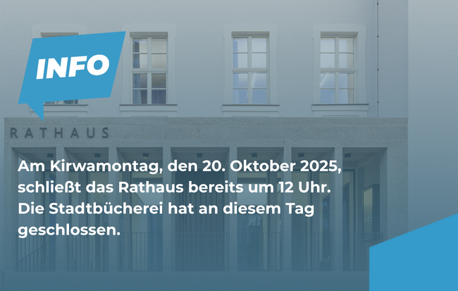 Am Kirwamontag (20.10.2025) schließen das Rathaus und die Tourist-Info bereits um 12 Uhr. Die Stadtbücherei hat an diesem Tag geschlossen.
