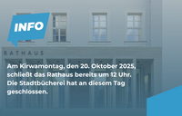 Am Kirwamontag (20.10.2025) schließen das Rathaus und die Tourist-Info bereits um 12 Uhr. Die Stadtbücherei hat an diesem Tag geschlossen.