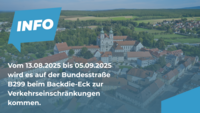 Wegen Bauarbeiten an der B299 und St2175 kommt es im Bereich „Backdie-Eck“ in Waldsassen zu Verkehrseinschränkungen. Die Arbeiten sind in drei Bauabschnitte unterteilt: Bauabschnitt 1 (13.08.–22